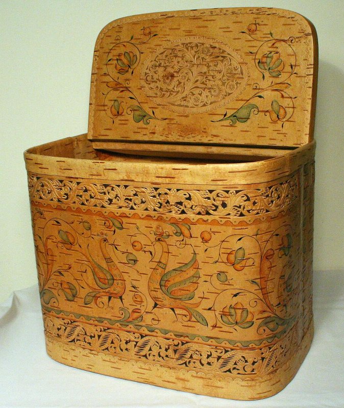 Техника тиснения по бересте представлена на примере изделий берестянщика из Архангельской области А.В. Шутихина.